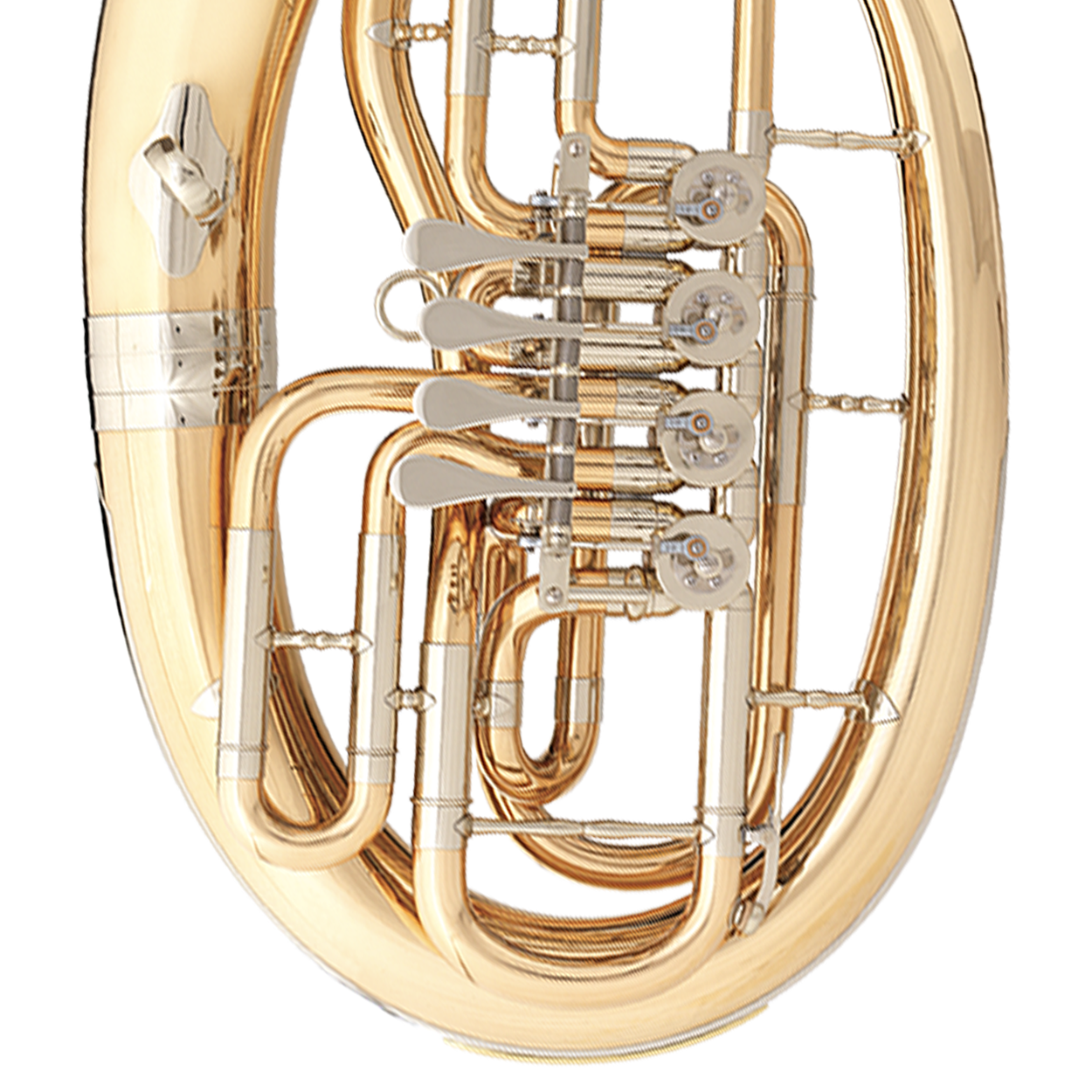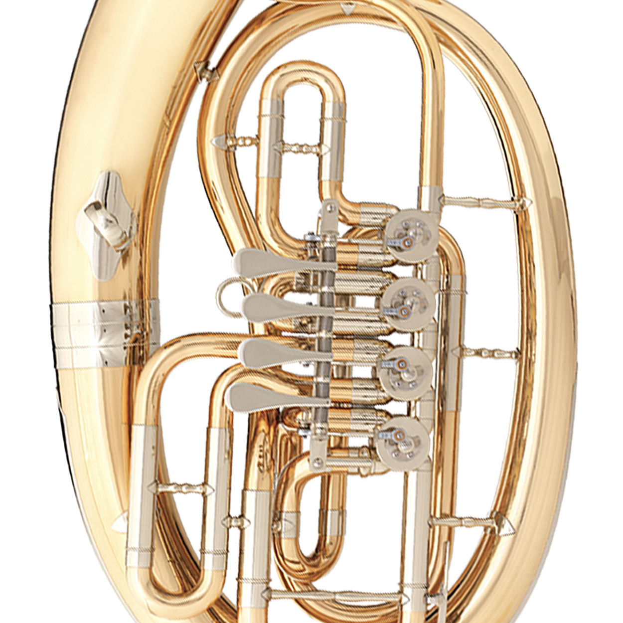 Explore the B&S Baritone 3046: handmade in Germany with 4 rotary valves for seamless performance. Features a graduated bore from .543" - .630", 11¾" bell, and clear lacquer finish for durability. Includes 3B™ linkage system for smooth valve action and goldbrass construction for rich sound. Perfect blend of tradition and innovation, complete with a convenient backpack-style case.
